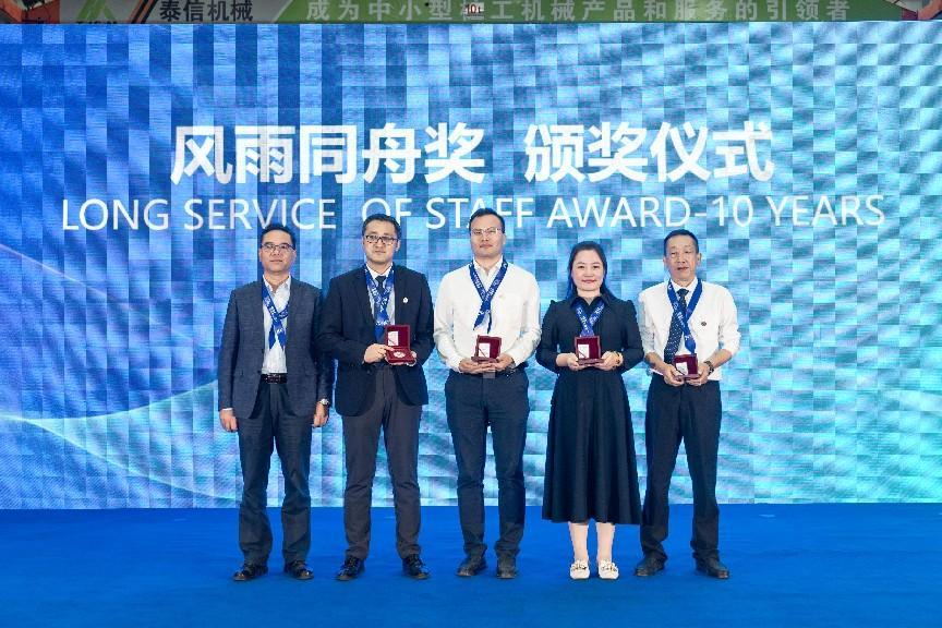 十年相伴,離不開泰信員工的辛勤付出,泰信機械董事長辛鵬、中國工程機械學會樁工機械分會秘書長郭傳新為泰信機械老員工頒獎并授紀念幣。